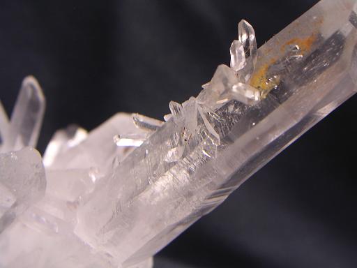細かなトゲ状の結晶が生えた大きなポイントが特徴的なクラスタ。剣はどれも素晴らしく透明度が高く、すらりとした鋭利な印象。部分的に入る赤茶っぽい付着や内包は、おそらく鉄由来のもの。画像の通り、安定して自立。