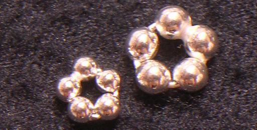 【スペーサー・ペンタ(銀製SV925)】 1個単位。5粒のビーズが花のように輪になったパーツで、通常はビーズとビーズの間に挟んで、スペーサーとして使います。小サイズ:1.5×3.8mm、中サイズ:2.0×5.2mm。 | |